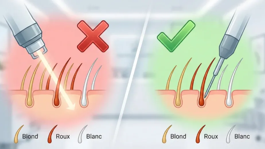 Limite utile : poils très clairs, blancs ou roux répondent mal ; une alternative comme l’épilation électrique peut être discutée selon le cas.